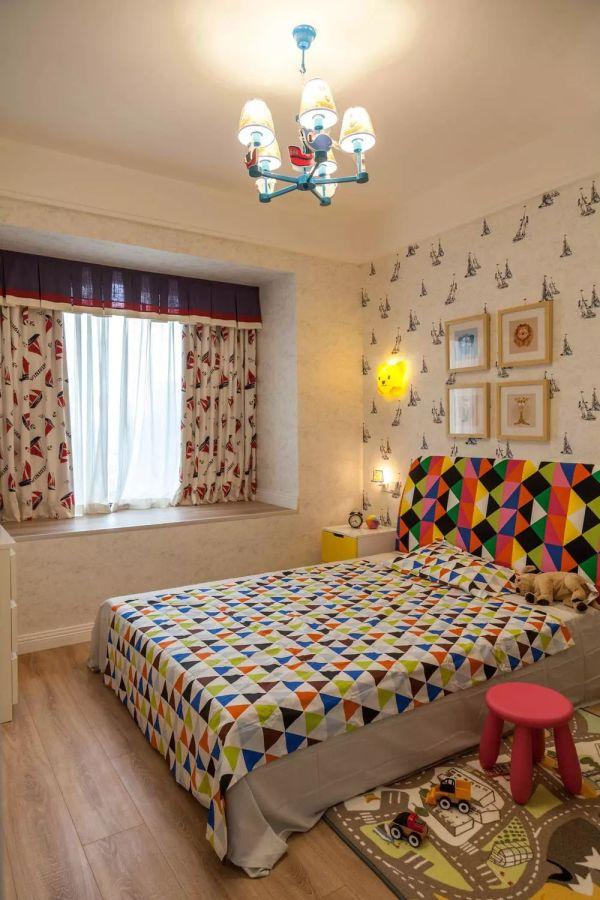 次臥,次臥的空間要小一些,但是布置的也很簡約,也是暖色調為主,床頭兩側都有暖光燈,更顯得臥室里溫暖。簡單的床鋪舒適大方,窗子不大,但是帶來良好的采光通風效果。還有兒童房,兒童房里用色活潑一些,顯得充滿活力。