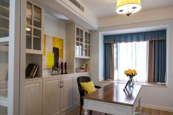 這是單獨的書房,書房的面積挺大的,整個空間看起來也很通透,到頂的書柜還帶有展示柜,擺放一些裝飾品彰顯品位,還有就愛你月的書桌,擺放上鮮花裝飾,看起來清新自然,消除沉悶的氣息。
