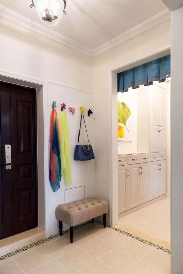門口是玄關,玄關處在墻面上做了動物頭形狀的掛鉤,很有創意,使用起來也比較方便,下面是換鞋凳,地面上還鋪了復古地磚以及馬賽克,心思巧妙,多了一些優雅復古的感覺。