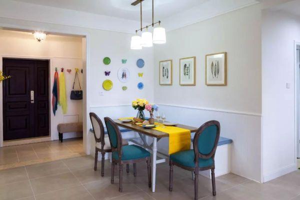 餐廳,進門之后先是看到餐廳,餐廳里墻面上掛了一些掛畫掛盤的裝飾品,不會顯得單調。餐桌是木材的,餐廳里還是卡座的設計,看起來有情調,使用起來可以容納很多人用餐,鮮黃色與深棕加暗綠色的餐桌椅碰撞出自然的鮮活氣息。