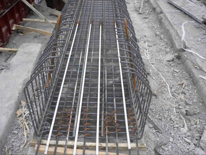 在施工中首先應該架設好相應的橡膠棒,把鋼筋骨架和定位網片捆綁好,接著把橡膠棒穿入定位網片的設計位置,而在插入的過程中,為了確保其定位準確,所以橡膠棒的整體應該保持平整,而從梁上的整體看,橡膠綁在梁內的位置應該保持一個平坦順直的位置。為了增加橡膠棒的剛性,以及為了防止橡膠棒在之后施工中發生局部變形。所以應該在橡膠棒內穿入一定的鋼絲。橡膠棒表面發生刮蹭現象的時候就不能用了。為了保證在施工中穿口位置的正確性,我們在預應力鋼筋施工的時候應該采用定位網控制,而定位網是采用事先在磨具上就已經焊接好的鋼筋骨架。