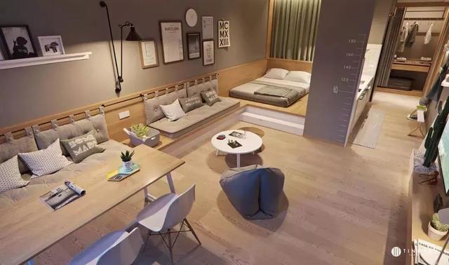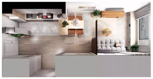 然而,在這種戶型里面,我們還可以設計滑動墻板提供隔斷。此外,再用地板和地磚進一步區分。