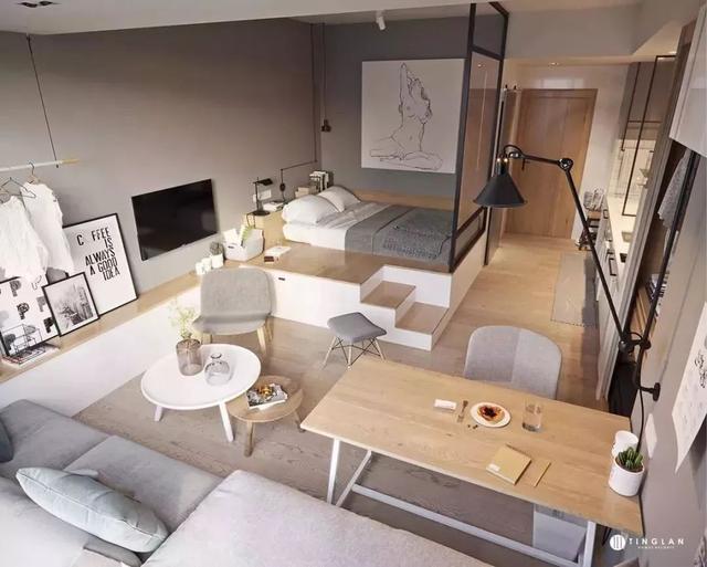 現代風格的一居室,幾乎沒有隔離空間,可以使用玻璃隔斷或紡織品來充當區分空間的辦法。