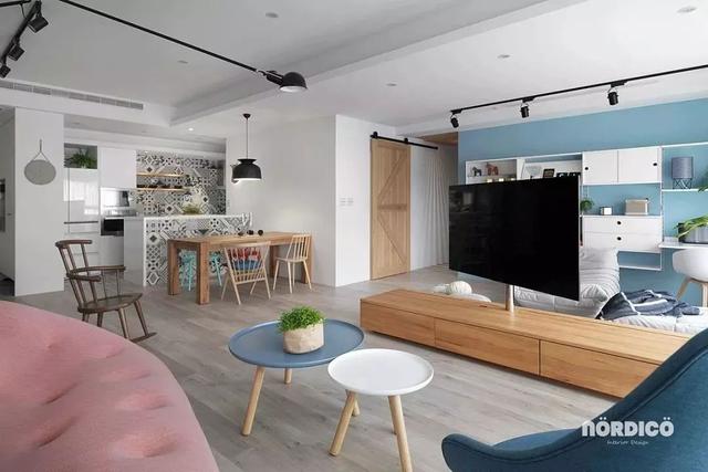 溫暖的木色,白色和青色的小圓點讓空間看起來更加柔和,而地毯、沙發餐桌則提高了室內的高級感。