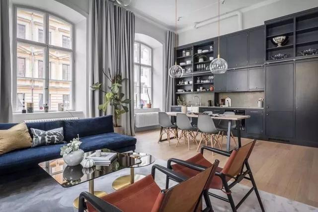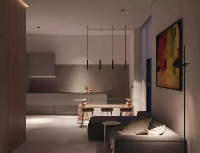 適合男性單身貴族的家,紋理墻壁,天花板,甚至腳下的豪華地毯都參與了廚房、餐廳和客廳的隔斷。
