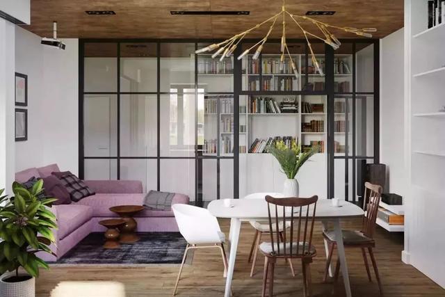 玻璃和金屬墻壁隔板也可以在狹小空間內形成分離。在這里,我們還看到客廳(明亮的沙發)和 餐廳組合(傳統與現代)的混合家具風格。