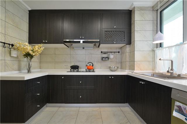 廚房裝修整體都是深棕色的櫥柜,再加上白色的臺面就顯得干凈整潔。