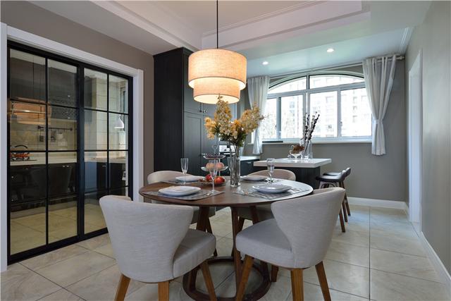 餐廳是用了圓桌,淺灰色的椅子,整體搭配在一起美觀又時尚。