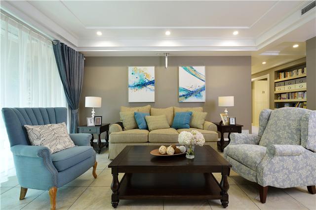 客廳視野開闊彩色的布藝沙發(fā)再加上風(fēng)景框畫讓人眼前一亮,棕色的茶幾更顯得沉穩(wěn)大氣。