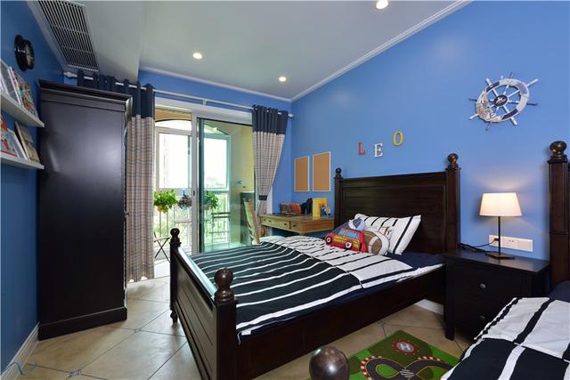兒童房用明亮的藍(lán)色貼滿壁紙,豎條的床單更能拉長視線。
