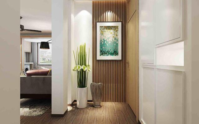 這種方案非常時尚清新,在正對門口的墻壁上采用了原木色的扣板裝飾,旁邊還有一盆高大的綠植,將玄關映襯的非常時尚清新,白色的玄關柜采用入墻式的安裝方式,既省空間又非常實用。