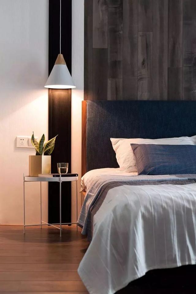 灰白的格子床品,搭配深藍靠墊和床頭,一個文藝又溫馨的休息空間展現出來。