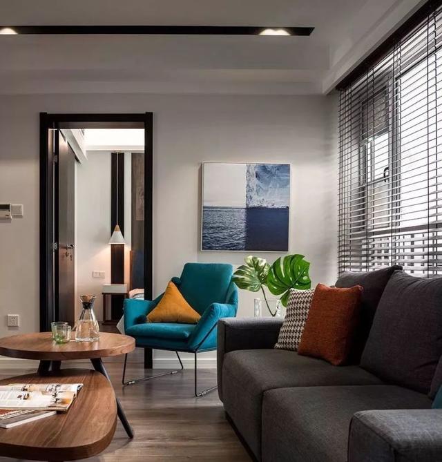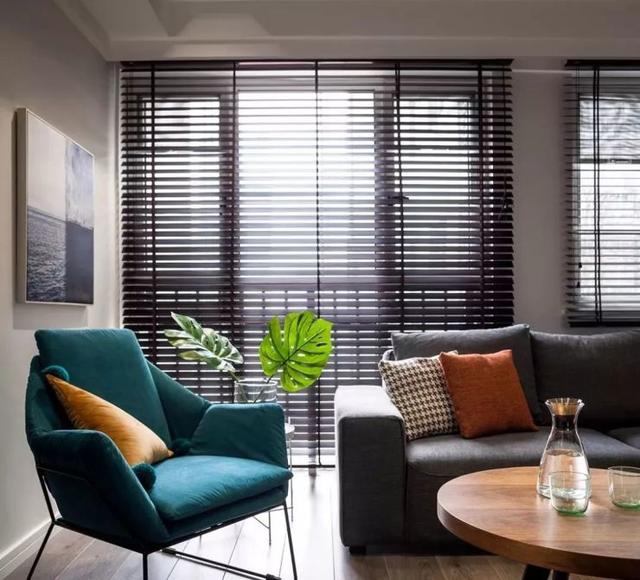 陽光通過百葉窗,暖暖地照在龜背竹上,給客廳一絲生機。藍色的單人椅,加上橙色靠墊,增添了客廳的文藝風。