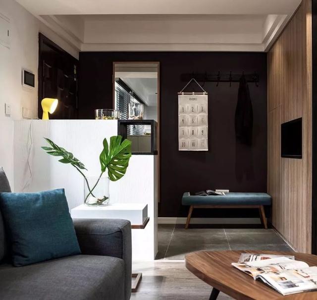 玄關處的吊頂采用了挑空設計,帶來視覺上的開闊感。小矮柜滿足主人收納鞋子,同時把玄關與客廳進行隔斷。全身鏡也方便主人出門前整理裝容,藍色的長條換鞋凳,點綴著昏暗的玄關,也方便了主人換上出門的鞋子。后方的的壁掛創意收納袋,也為小物件的存放提供了方便。