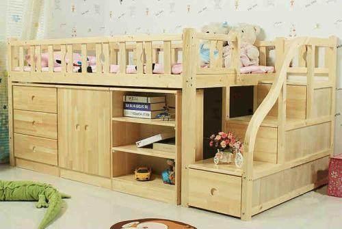 也可以把床設計如上圖一樣設計,樓梯可以用來收納,另外一個開放的小書柜,可以放一些玩具,或者是一些書籍來裝飾,另外的抽屜可以折疊衣物,大一點的柜子可以收納一些外套等東西。