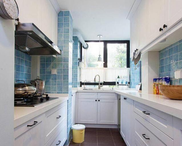 廚房入門面對(duì)的就是窗戶,采光和通風(fēng)都不成為題。U型櫥柜格局設(shè)計(jì)的不錯(cuò),烹飪區(qū)邊上砌了隔斷墻,以后不用擔(dān)心油煙的問題,藍(lán)色的墻面與白色灶臺(tái)柜子,表現(xiàn)廚房簡(jiǎn)單大方,實(shí)用美觀。
