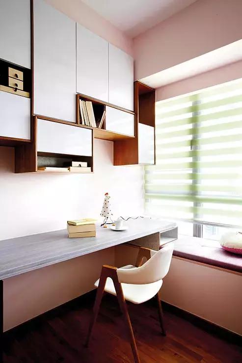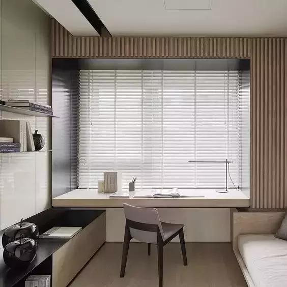 將飄窗打造成工作區也十分常見,窗外的光線充足,累了還可以眺望風景放松眼睛。依著窗沿打造三面式的書桌設計,有再多文具雜物也不怕。這個時候,小編提醒大家,飄窗式飄窗式工作區桌面進深一定要足夠,這樣才能很好的安置我們的腿,避免坐下的時候產生不適,反而影響我們學習工作的效率。