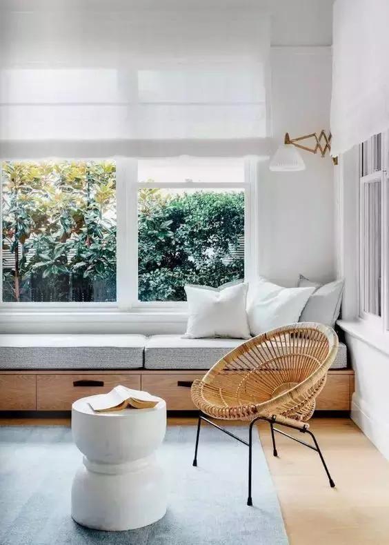 休閑式的飄窗區,設計比較隨意舒適,可以用來喝下午茶、休息、讀書。可以設置在客廳或臥室區域,同時最好設計出一部分收納功能,還能減輕家中儲存的壓力,一舉兩得。