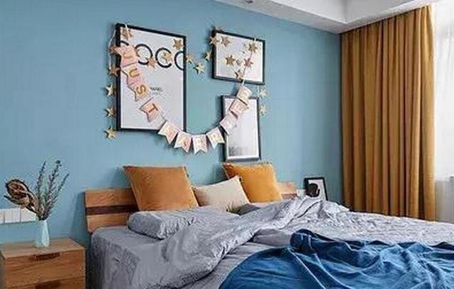 臥室里一個大衣柜、一張床以及兩個床頭柜便構成了這里的全部。天藍色的背景墻面上掛置了三幅黑框裝飾畫,搭配星星以及字母掛飾,非常夢幻可愛。亮黃色的抱枕與窗簾相呼應,搭配各種原木家具,極大的增加了空間里的溫馨感。