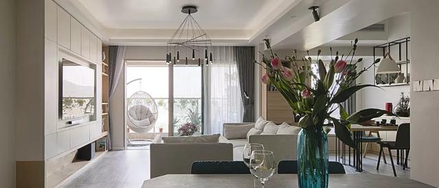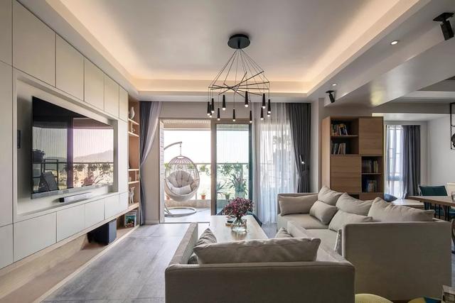 簡潔吊頂,天花一盞“扯線”吊燈,米灰色沙發不靠墻,而電視墻則以封閉白柜+木質開放柜打造,整體帶來簡單輕松的情調。