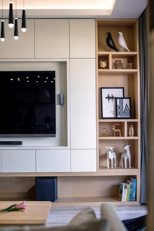 電視墻以白柜作過渡,木質展示區即使有再多的擺件也不會搶電視的戲,在保證觀影體驗的同時也滿足了收納。