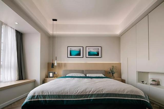床頭木質護墻板,灰色的床頭靠背,鋪上墨綠色+白色的床單,加上簡約的黑白床頭吊燈,而通頂的白衣柜留有開放展示區,整體打造出簡單純粹的舒適感。
