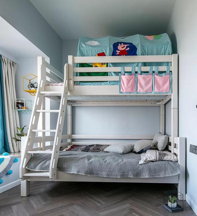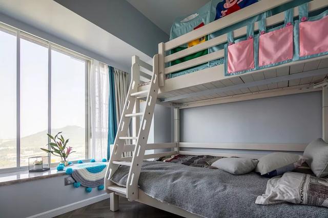 天藍色的墻面基調下,擺了一張上下床,上鋪增設了三個掛袋方便收納,而飄窗處加裝黃、藍色的簡易擱架,充滿了實用情趣。