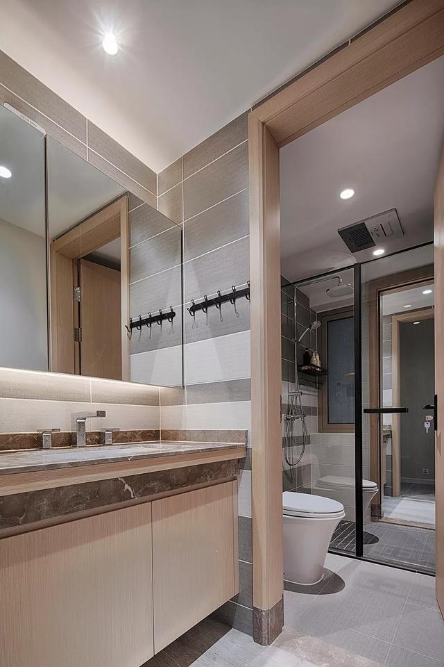 衛生間干濕分離,干區墻面以灰、白色交錯的墻磚豐富了層次感。而淋浴區以鏡面推拉門作隔斷,帶來別致的視覺效果。