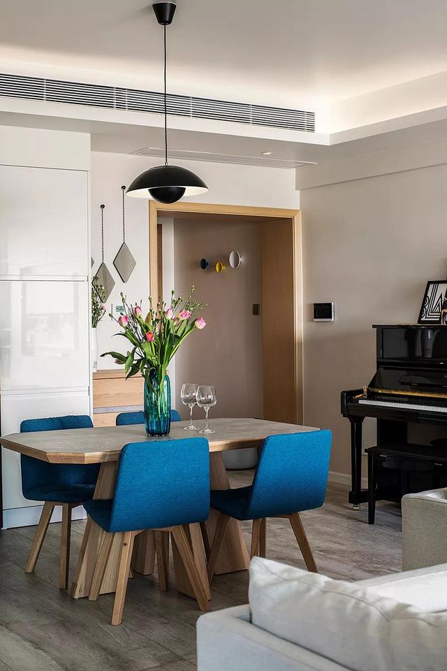 實木打造的一套餐桌,以藍色靠背的餐桌椅補充了活躍度,顯得安靜又不會跳脫。