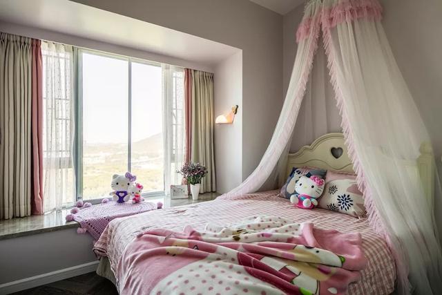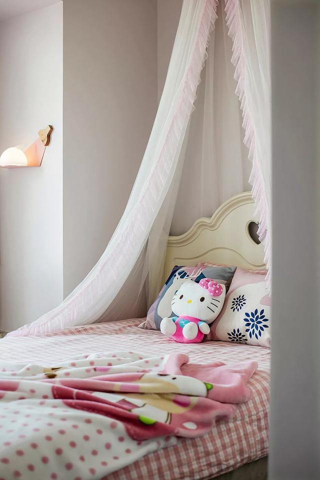 象牙白的床頭靠背,搭配粉色系的床單,加上一款公主帳,打造出專屬于家里小棉襖的浪漫溫馨。