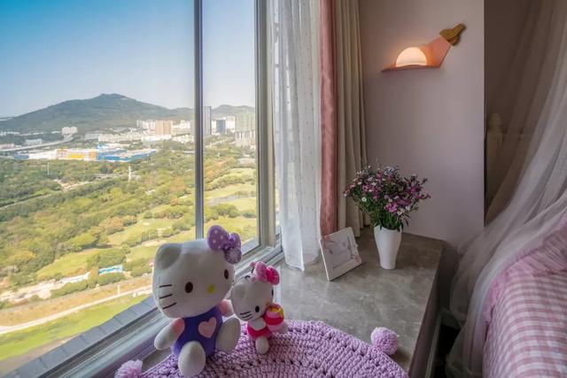 大理石臺面的飄窗布置上坐墊、玩偶和鮮花,配合墻面手電筒式的擱架燈,充滿了自然童趣的俏皮氣息。