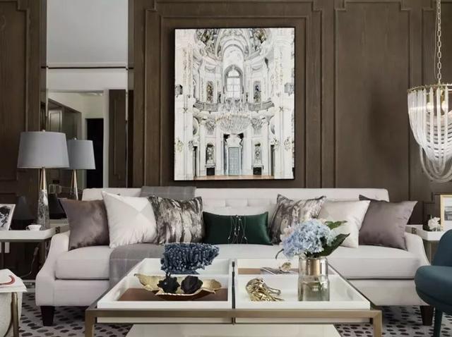 原木淺棕色的細框線搭配上宮廷畫,以及奢華的各類家具用品,輕松讓整個客廳彌漫著一種古典優雅感。