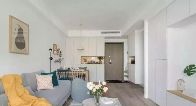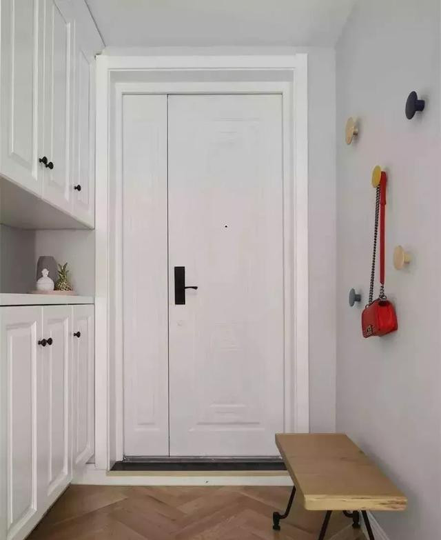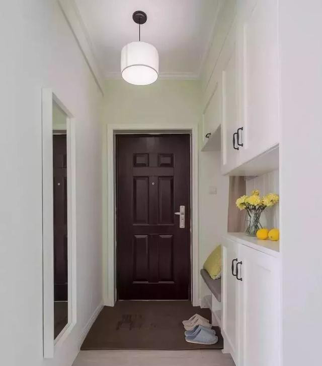 上面的無玄關型講完了,其實還有一種戶型也很常見,入戶門是直接開在墻面的『中間』位置,兩邊都『無依無靠』,即沒有墻體可以做玄關,也沒有一個類似凹凹的空間打造一個玄關,進門直接是走廊,或者進門直接是廳。讓我們來看看,可以如何解決吧!