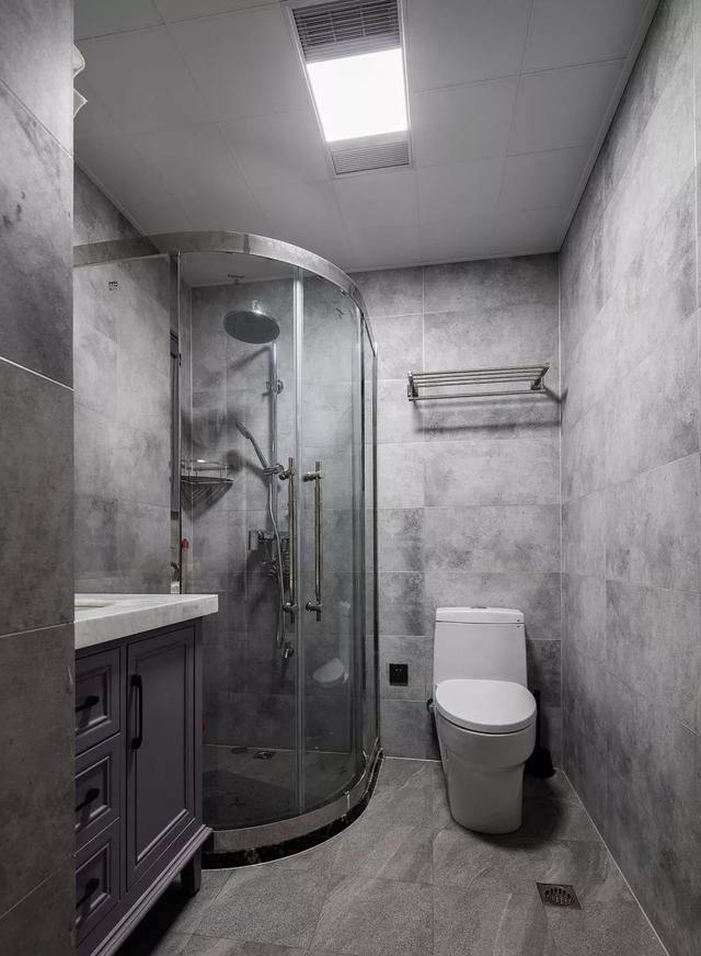 次衛的設計以實用為主,把淋浴房設計在了角落里,弧形的淋浴房更為節約空間,也更加的安全,灰色為主的次衛干凈利落。