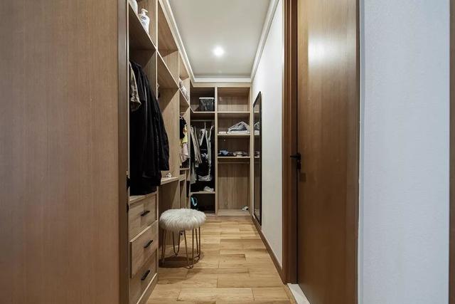 家里還有一個獨立的衣帽間空間,L型的開放式柜子布局搭配墻面的穿衣鏡和小矮凳,方便屋主一家人更換衣服。