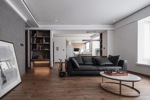 客廳處的空間不算很大,屋主個人比較喜歡投影的觀影感覺,所以直接用白墻作為電視背景墻,也和黑色的皮質沙發形成了對比。