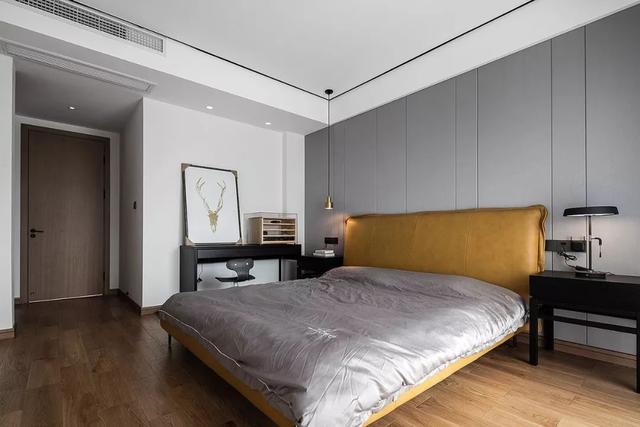 主臥室的床頭做了淺灰色的硬包設計,搭配黃色的床和大氣的黑色書桌、床頭柜等,在簡潔中展現貴氣。