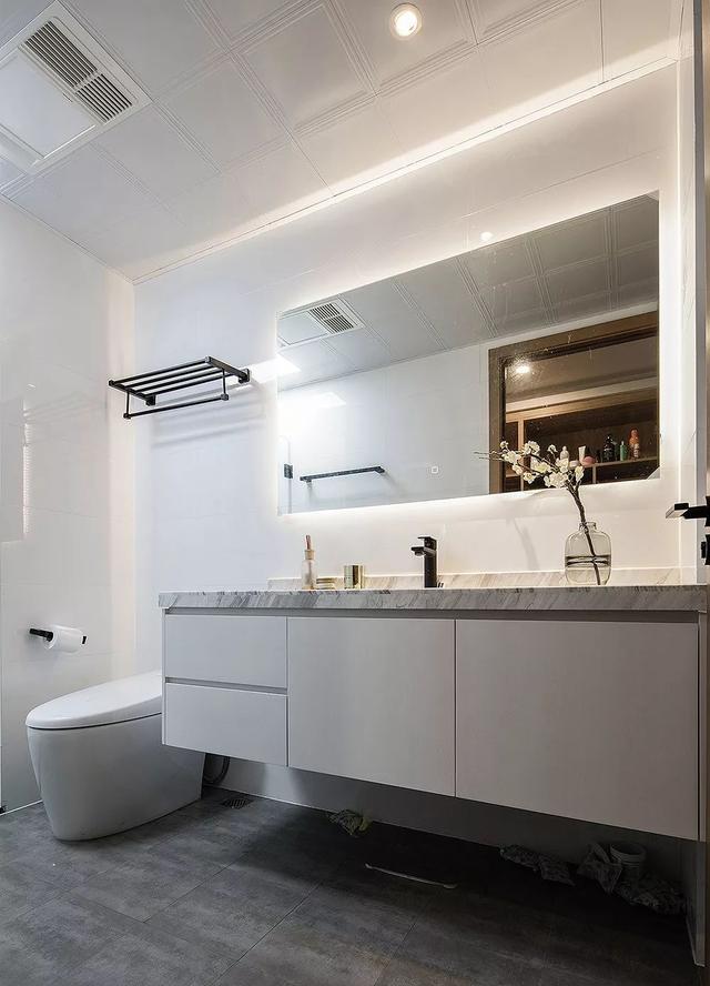 主臥衛生間的設計非常的時尚、大氣,鏡子的四周都做了藏光的設計,大理石的臺面和灰色的地面構成一種簡潔、大方的感覺。