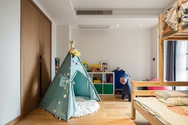 兒童房內留出了角落空間給來孩子打造娛樂區,帳篷加上地毯、可愛的玩偶、小矮柜等等結合起來,讓這個兒童房空間既實用又充滿了童趣。