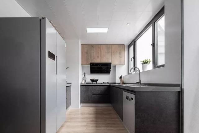 灰色的做舊櫥柜搭配木色的做舊吊柜,U字型櫥柜布局的廚房空間,給人一種簡約而又復古的感覺,非常有格調。