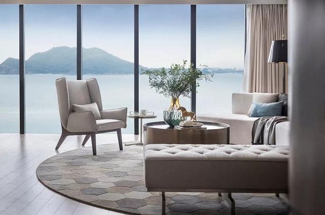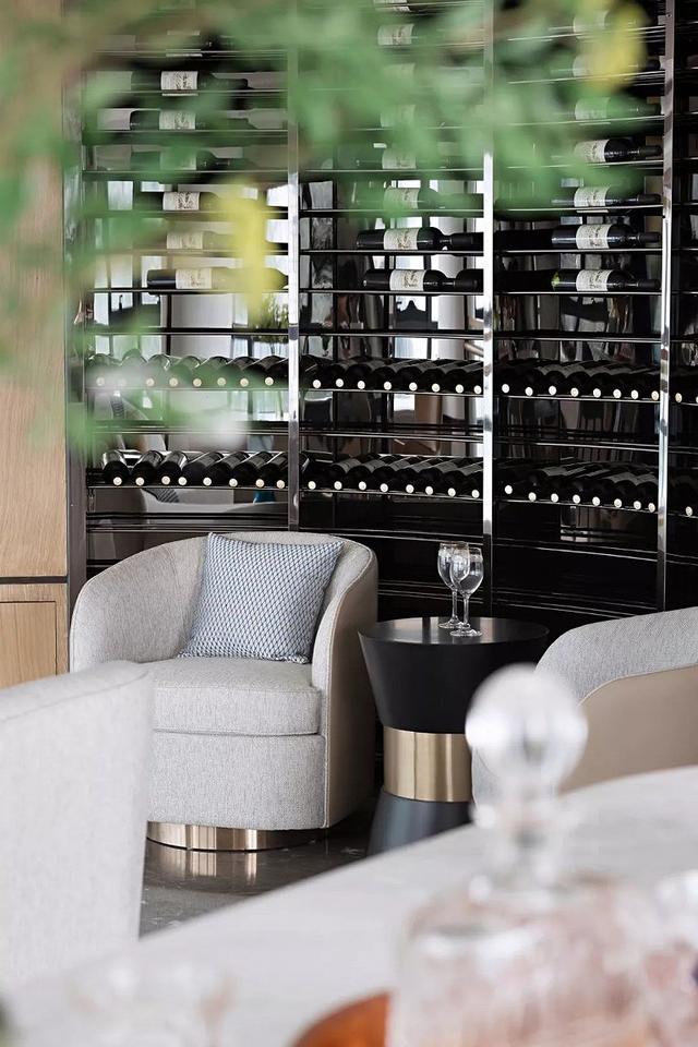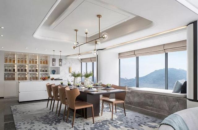 大面積的通體落地窗,將絕美風光引入室內。敞開式的生活起居功能協調連貫,曲線優美的背景墻,避免空間產生冗長感,且與窗外連綿不絕的海景相互呼應。