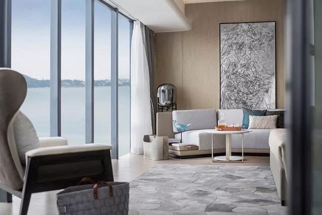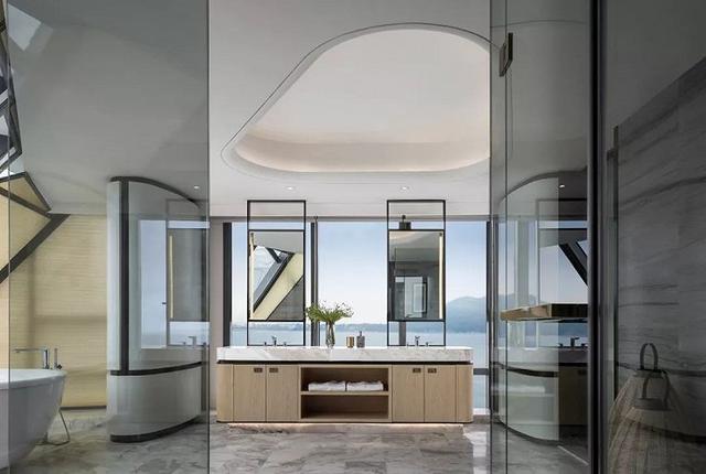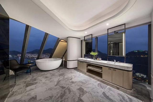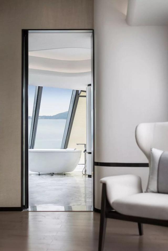 浴室線條簡單利落,大面的玻璃窗強化了室內的穿透感,能更純粹的接受陽光的洗禮。臨窗望海的全景浴缸,可以讓你領略到坐擁港灣的樂趣。