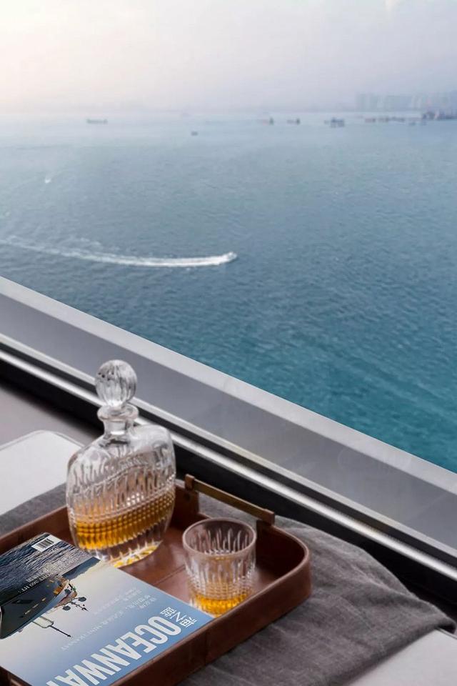 眺望窗外水岸,船身影縹緲滄海一粟,小酌一杯享受超越物質外的情感。