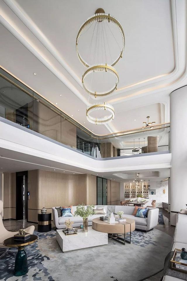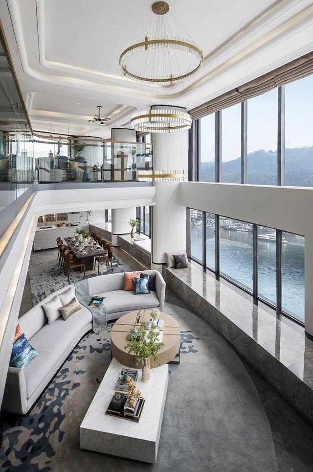以游艇、浪花為靈感,室內如潔白純凈的游艇空間,自然下垂的水晶吊燈光彩奪目,串聯在一起的圓形彌漫出精妙絕倫的靈動氣息。流暢的線條縮小了空間隨樓層增高而縮小的問題,靈活布局讓日常生活也充滿了樂趣。