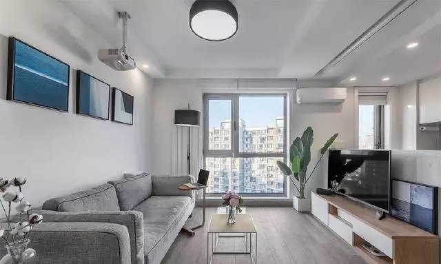 灰色系籠罩了客廳,在靠窗位置擺放了容納兩人的布藝沙發,以及小小的木質個性茶幾。但是在整體的設計上,和諧,舒適。客廳中綠植,以及簡單的掛飾起到了不可忽視的作用。