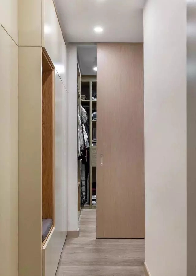 這是定制的衣帽間,面積小,使用了推拉門,符合生活中的需求。
