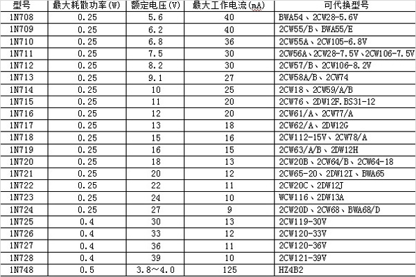 有3道色環,且第2、3兩道色環顏色不同的。標稱穩定電壓為兩位整數并帶有一位小數,即“××.× V”(幾十幾點幾伏)。第1環表示電壓十位上的數值。第2環表示個位上的數值。第3環表示十分位(小數點后第一位)的數值。不過這種情況較少見,如:棕、黑、黃(10.4V)和棕、黑、灰(10.8V)常用穩壓二極管的型號對照表(注:后面的二極管型號是以1開頭的,如1N4728,1N4729等)。