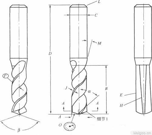 A一鉆刀直徑;B一鉆體長度;c一鉆柄直徑;.D一鉆刀總長度;F一排屑口;G-鉆芯厚度;I1-刃帶寬度;I2-刃帶角;J-棱邊寬度;K-刃帶間隙;L-導角;N-橫刃角;O-刃緣高度;R-內圓角半徑;d一螺旋角;p-頂角;y-第一后角;&-第二后角。