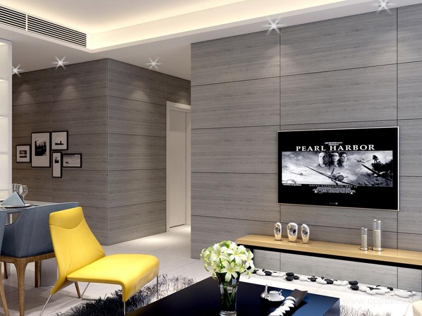 這款平板護墻板,簡單的平面造型搭配歐鉑尼孔雀灰色,既襯托了全屋主打的現代簡約風,護墻板表面的木紋的肌理效果還能讓“簡單”更具特色,同時設計師還巧用黃金比例來規劃護墻板的面積大小,兩種大小的護墻板交錯排列,使空間更具美感,且充滿層次,簡單而又豐富。