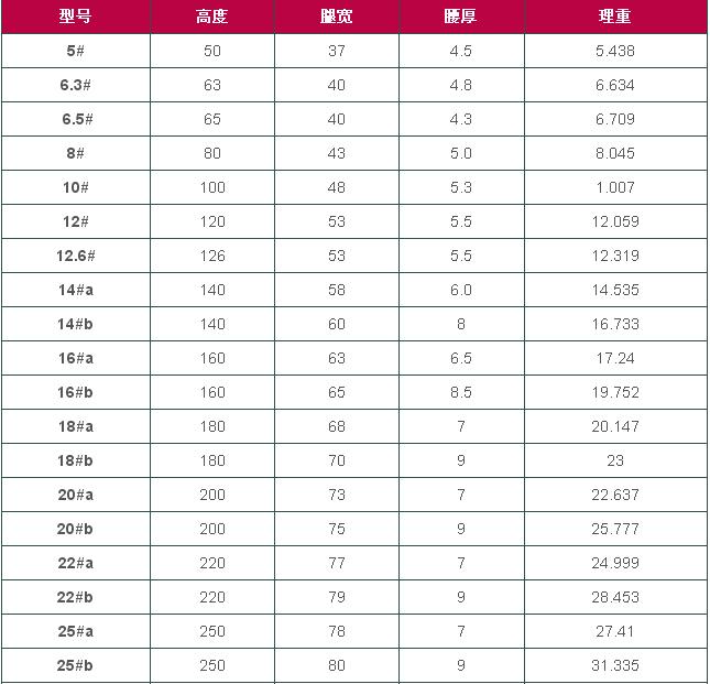 槽鋼的表面質(zhì)量和幾何形狀的允許偏差在標(biāo)準(zhǔn)中有具體規(guī)定。要求槽鋼表面不得存在用上有害的缺陷,不得有顯著的扭轉(zhuǎn),規(guī)定槽鋼波浪彎的允許值及各規(guī)格槽鋼面形狀的有關(guān)參數(shù)(h ,b ,d ,t 等)的數(shù)值、允差值。槽鋼幾何形狀如果不正確主要表現(xiàn)是:角、腿擴(kuò)及腿并等。槽鋼理論重量表單位:kg/m、mm。槽鋼理論重量表規(guī)格表示方法如5#50*37*4.5*6.928*5.438,表示規(guī)格為5#,腰高為50mm,腿高為37mm,腰厚為4.5mm,截面面積為6.928cm,理重為5.438。